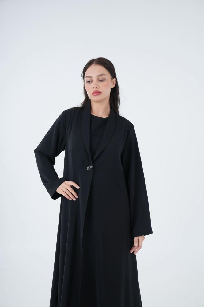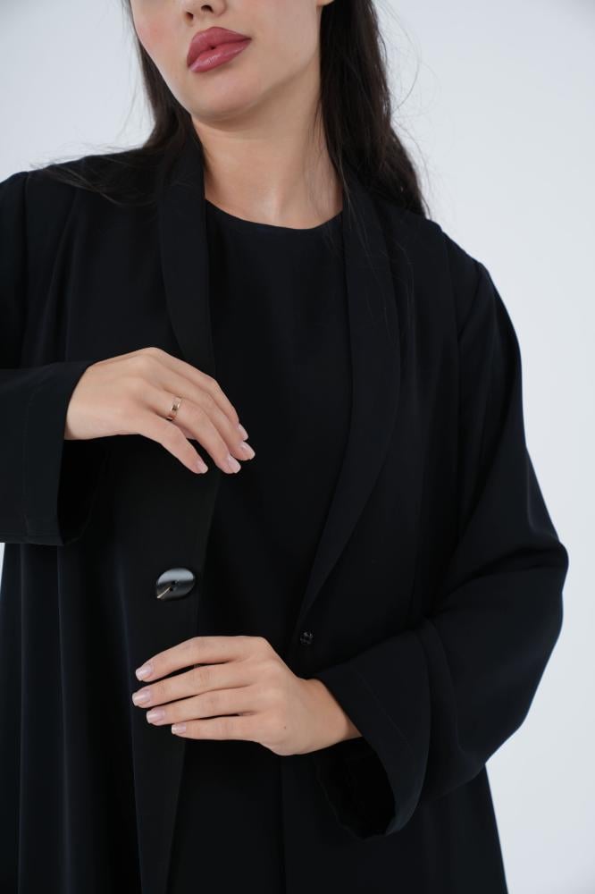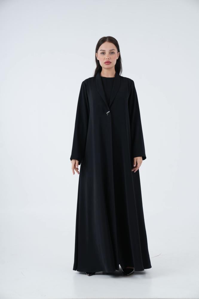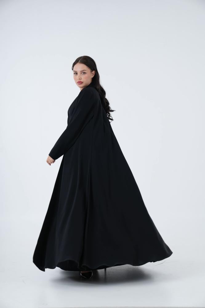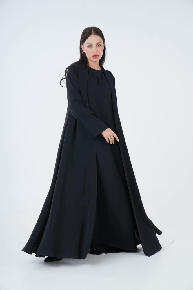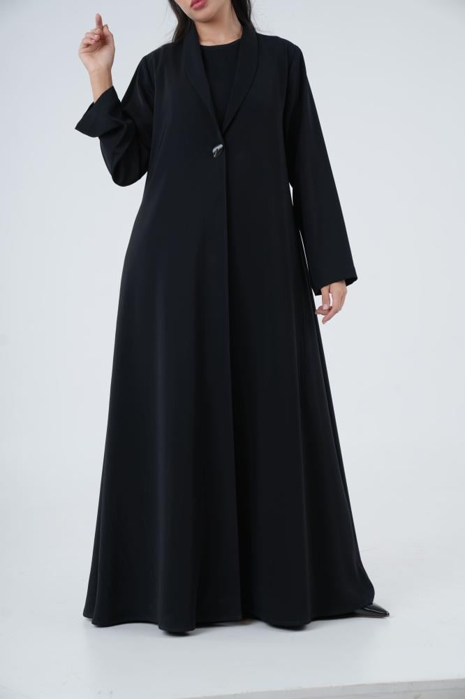 عباية A-Line من قماش كريب كوري باللون الأسود، يحتوي على فستان داخلي من نفس القماش وزرار عودي فاخر.