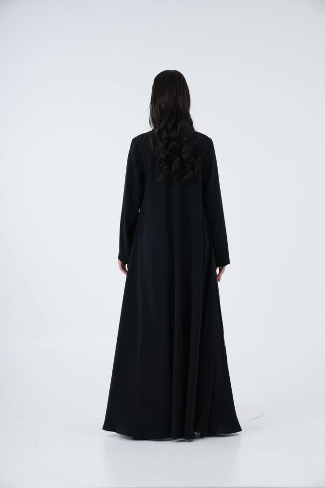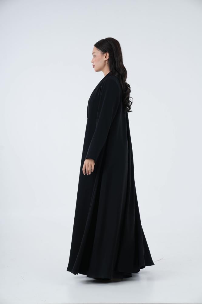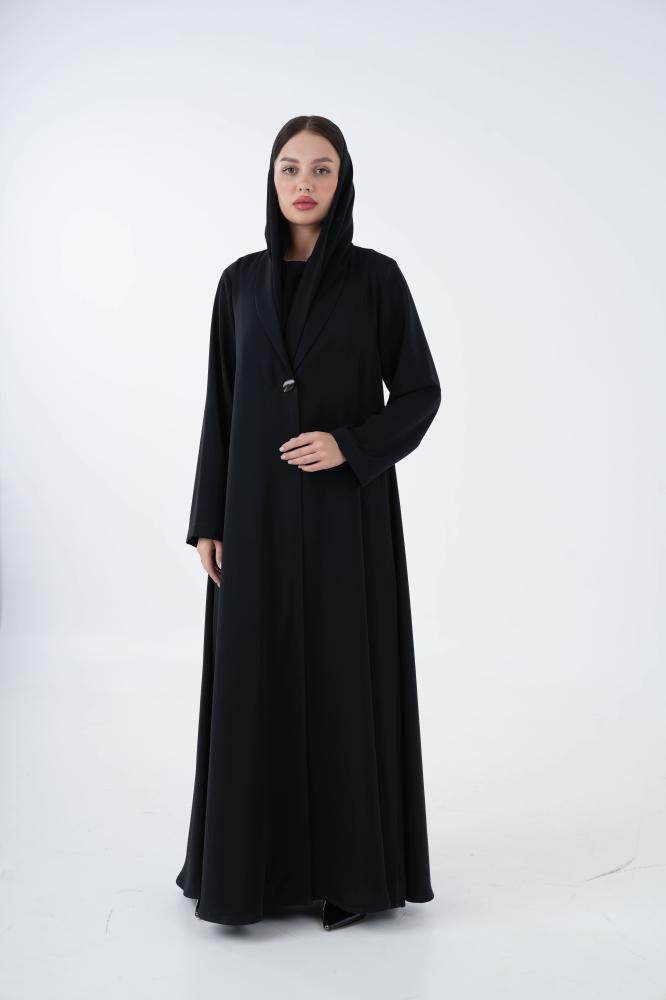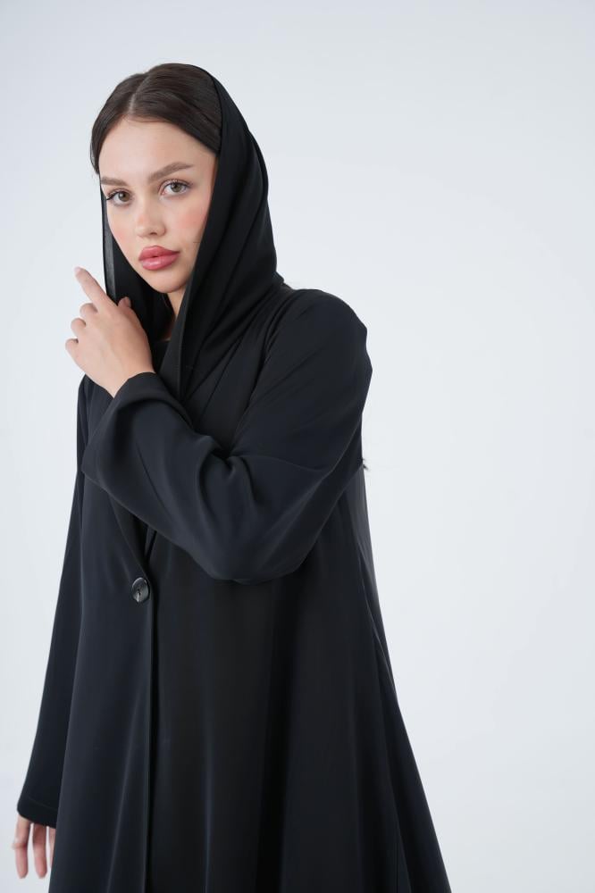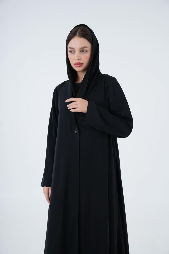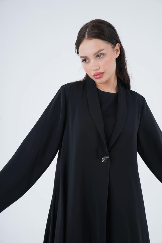 عباية A-Line من قماش كريب كوري باللون الأسود، يحتوي على فستان داخلي من نفس القماش وزرار عودي فاخر.
